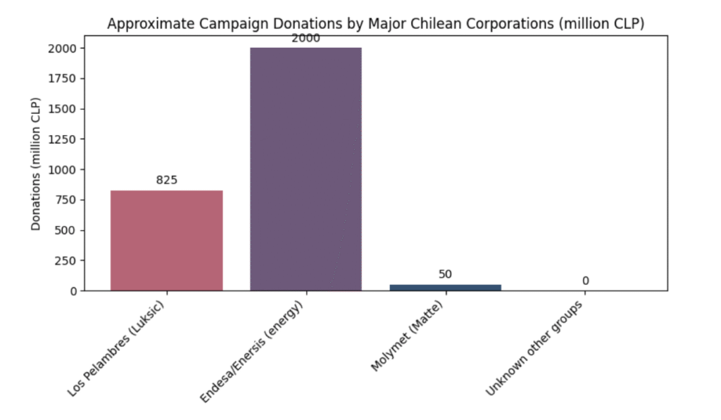 The chart above uses figures from CIPER reports: Minera Los Pelambres (Luksic group) approved up to 825 million pesos (36,000 UF) for one election; Endesa and Enersis together donated roughly 2 billion pesos (about US$3.5 million) by splitting contributions across subsidiaries; Molymet (partly owned by the Matte family) approved 50 million pesos. “Unknown other groups” represents donors whose amounts remain undisclosed due to reserved contributions. The disparity illustrates how energy firms and mining subsidiaries could outspend other sectors. It also shows why reforms sought to cap donations and ban corporate giving.