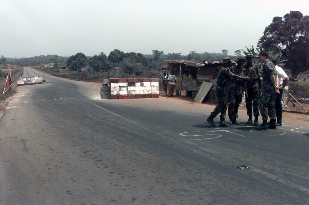 Shown is one of six security checkpoints on the 36 mile road leading from Roberts International Airport to Monrovia, Liberia. The checkpoint is being guarded by Economic Community Military Observation Group (ECOMOG) Nigerian Army Troops. The airport is being used by the United States Military during Operation ASSURED LIFT. The airport runway is two miles long and is being used by United States Air Force C-130E Hercules aircraft from the 86th Air Wing out of Ramstein Air Base, Germany. ASSURED LIFT is a Joint Task Force Operation to provide airlift and other logistical support to West African states that are deploying more than 600 troops to Liberia as part of the region’s ongoing peacekeeping mission. Most of the inbound West African forces will come from the country of Mali, with the Ivory Coast and Ghana also expected to contribute troops.