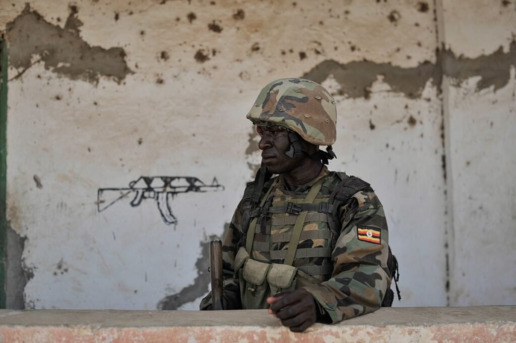 A Ugandan soldier, as part of the African Union Mission in Somalia, stands outside a former al Shabab barracks on April 29 in Qoryooley, Somalia, a little over one month after the town was captured from the extremist group by African Union forces. AU UN IST PHOTO / Tobin Jones